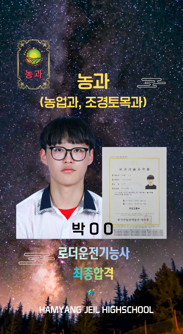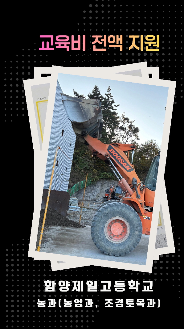 로더운전기능사 교육기관에서의 교육을 위한 교육비를 전액 지원받아 취득하였습니다.함양제일고등학교 농과(농업과, 조경토목과)는 농과 학생들이 취업하고자 하는데 필요한 모든 지원을 아끼지 않습니다.함양제일고등학교 농과(농업과, 조경토목과) 학생들은 27종의 국가기술자격증 취득 교육을 무료로 받을 수 있습니다.