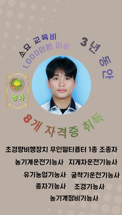 함양제일고등학교 농과(농업과, 조경토목과) 김O수 학생이 한국산업인력공단으로부터 우수기능인 표창을 수상하였습니다.김O수 학생은 고등학교 3년 동안 무려 8개의 자격증을 취득하였고, 이에 대한 모든 교육비(1,000만원 이상)를 함양제일고등학교 농과(농업과, 조경토목과)로 부터 지원받았습니다.함양제일고등학교 농과(농업과, 조경토목과)로 입학해서, 무한한 교육기회를 얻어가세요!!!