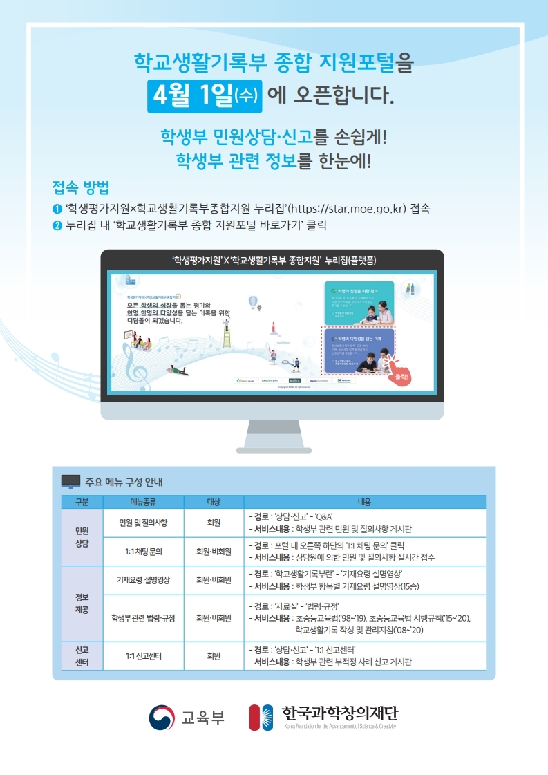 학교생활기록부 종합 지원센터와 관련하여 붙임과 같이 안내드리오니, 자세한 내용은 가정통신문 내용을 확인하여 주시길 바랍니다.