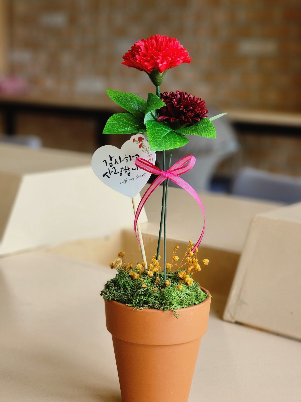 예쁜 카네이션 비누꽃과 프리저버드 안개와 이끼를 이용하여 소담한 미니 화분을 만들어보았습니다.