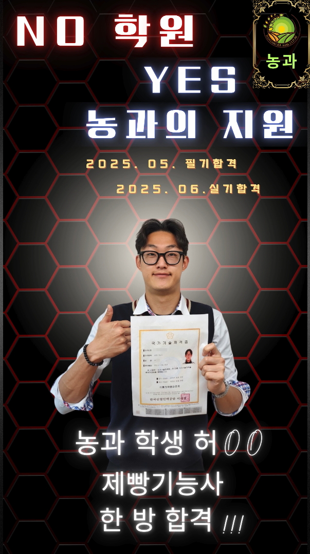 함양제일고등학교 농과(농업과, 조경토목과) 학생인 허OO 학생이, 방과후 수업을 듣지도, 학원을 다니지도 않고, 농과의 시설(건식가공실)과 농과의 지원(연습재료비 무한 지원)만을 활용하여 빠른 기간 내에 제빵기능사를 가볍게 취득하였습니다. 함양제일고등학교 농과는 농과 학생들 중 제과나 제빵기능사 필기를 취득한 학생들을 대상으로 방과후 수업을 운영함은 물론이며, 방과후 수업 실시 전이나 끝난 후에도 학생들이 원하면 실습공간과 실습용 재료를 합격할 때까지 지원하고있습니다. 학원가도 결국 가장 중요한 '개인연습'은 마음대로 못합니다. 함양제일고 농과는 가능해요!